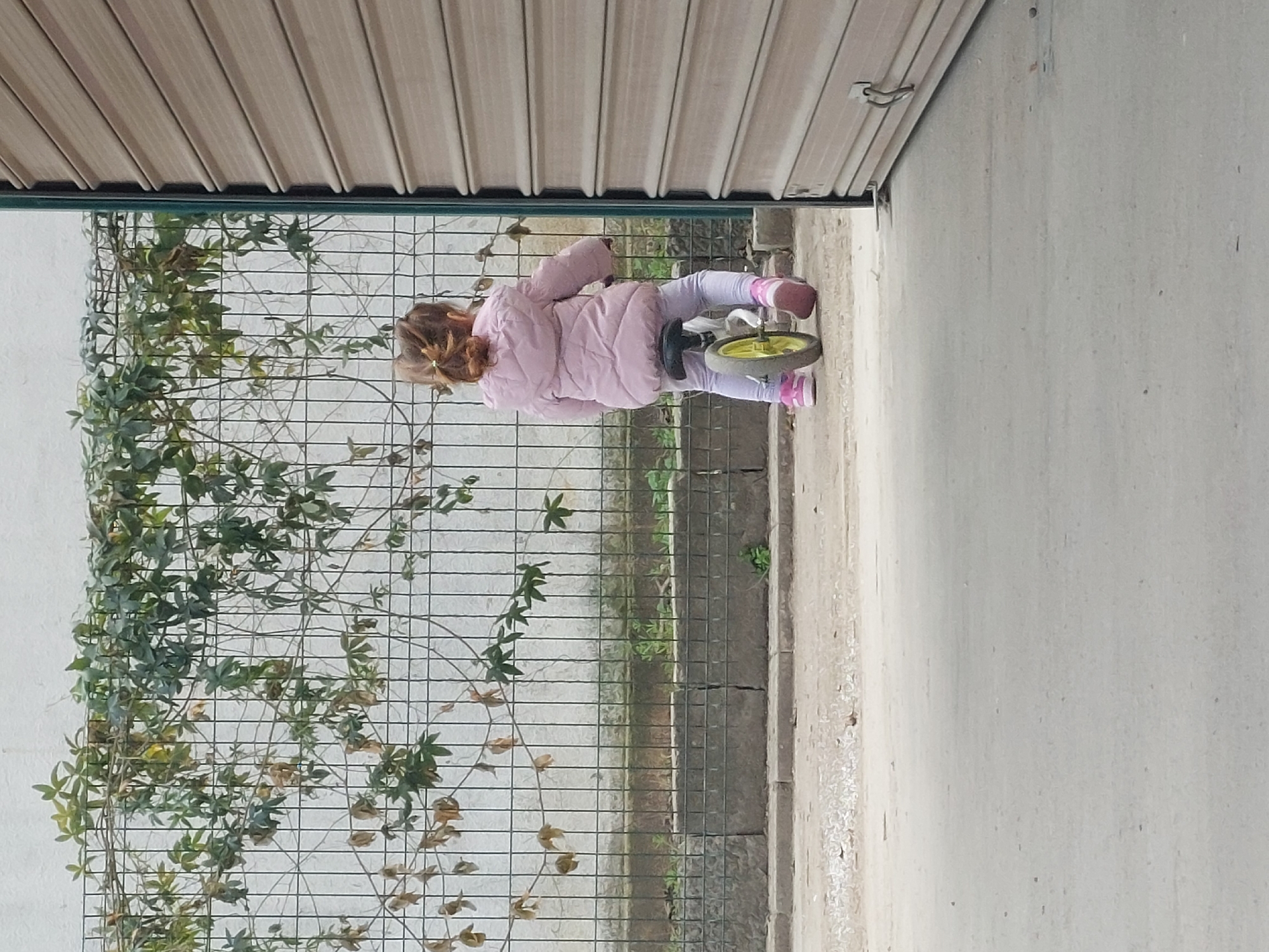 A young child is riding a tricycle on a narrow paved area. The child is wearing a pink jacket, light-colored leggings, and pink shoes. The tricycle has a yellow front wheel. A metal fence covered in climbing plants is visible behind the child. A roller door is overhead. The scene appears to be a narrow passage or alleyway. It is difficult to confirm the exact location within Plovdiv, Bulgaria, without additional location-specific context.