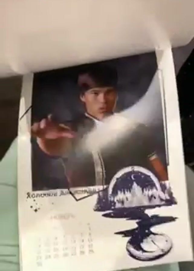 person flipping through a calendar. The calendar contains images of people in what looks like traditional costumes. Each page of the calendar corresponds to a different month and features a person's photo, name, and calendar dates for that month. The months shown include December, November, October, and January. The person holding the calendar has a painted fingernail. They are sitting on a seat covered in pale green cloth.
