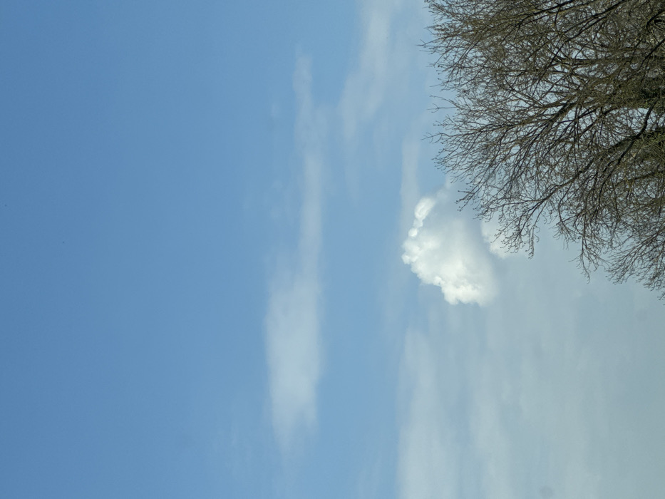 The image depicts an outdoor daytime scene in Geispolsheim, France, dominated by a clear, light blue sky with scattered clouds. The upper two-thirds of the frame show a mostly clear expanse of blue. In the upper left quadrant, a horizontal, elongated white cloud is visible. Below this, slightly to the left of the image's vertical center, a more substantial, distinct cumulus-like cloud with defined edges is present. The lower right quadrant of the image is occupied by the upper canopy of multiple leafless deciduous trees. Their dark, intricate branches and twigs are silhouetted against the sky, indicating a dormant period, likely late winter or early spring. No individuals, human activity, or man-made structures are visible.