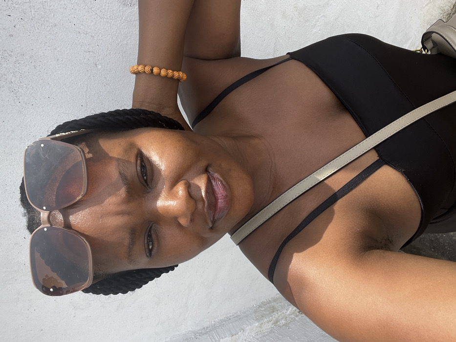 A close-up selfie depicts a female individual with dark skin and dark braided hair, looking directly at the camera with a neutral expression and slightly parted lips