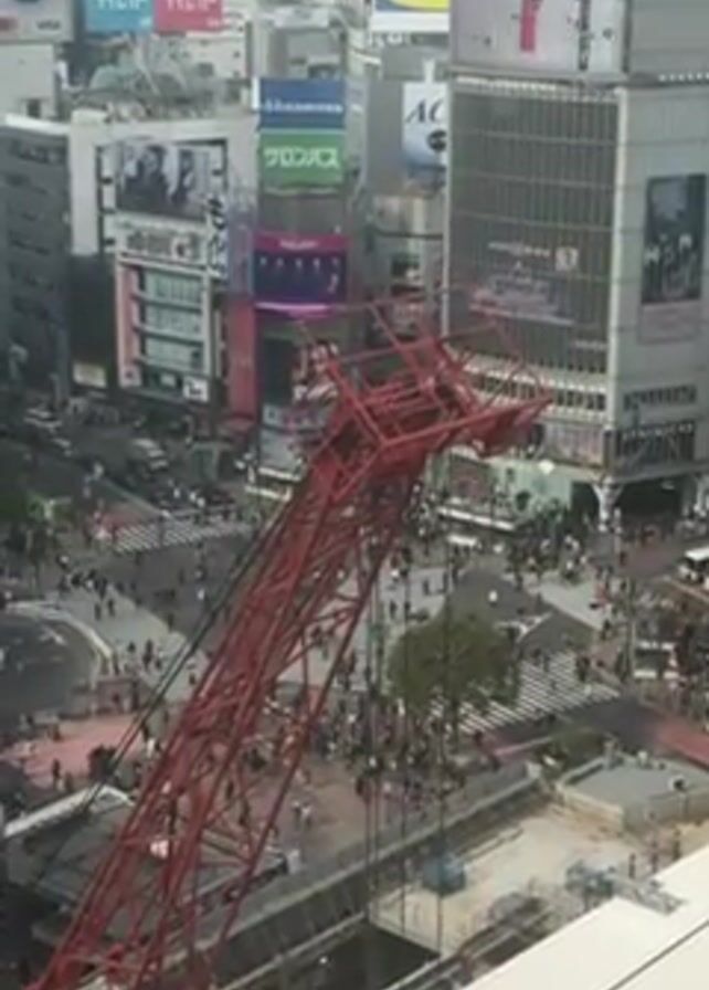 The camera captures a high-angle view of a bustling city intersection in Japan, with pedestrians crisscrossing the zebra crossings. In the foreground, a large, red lattice crane is visible. Beyond the crane, several buildings display large advertisements, including ones for IKEA, Coca-Cola, and YouTube. The scene suggests a busy urban environment undergoing construction or renovation.