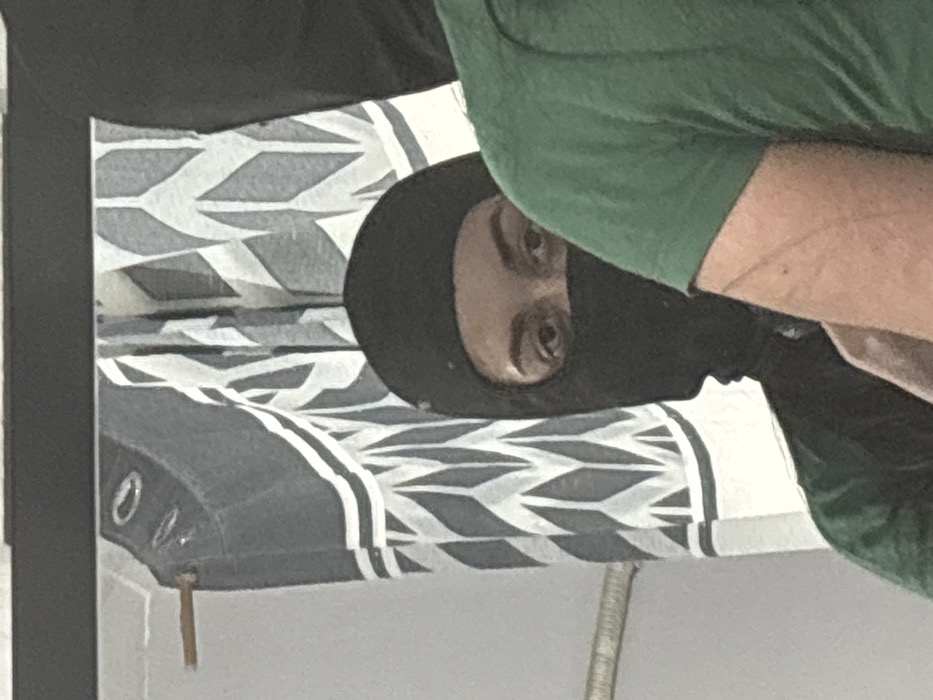 The scene, located indoors in Chirpan, Bulgaria, features two individuals in close proximity. A person wearing a black balaclava, with only their eyes and eyebrows visible and directed forward, is positioned centrally, wearing a green t-shirt. Partially in the foreground, obscuring the balaclava-clad individual's right side, is the upper right arm and shoulder of a second person, also in a green t-shirt. This arm exhibits several faint linear marks. A dark, indistinct shape, potentially another person's head with a dark covering, is visible on the far right edge. The background consists of a grey curtain with a white geometric pattern, featuring a horizontal white stripe near its visible bottom edge. A light-colored curtain rod is visible to the left of the curtain, set against a plain light wall.