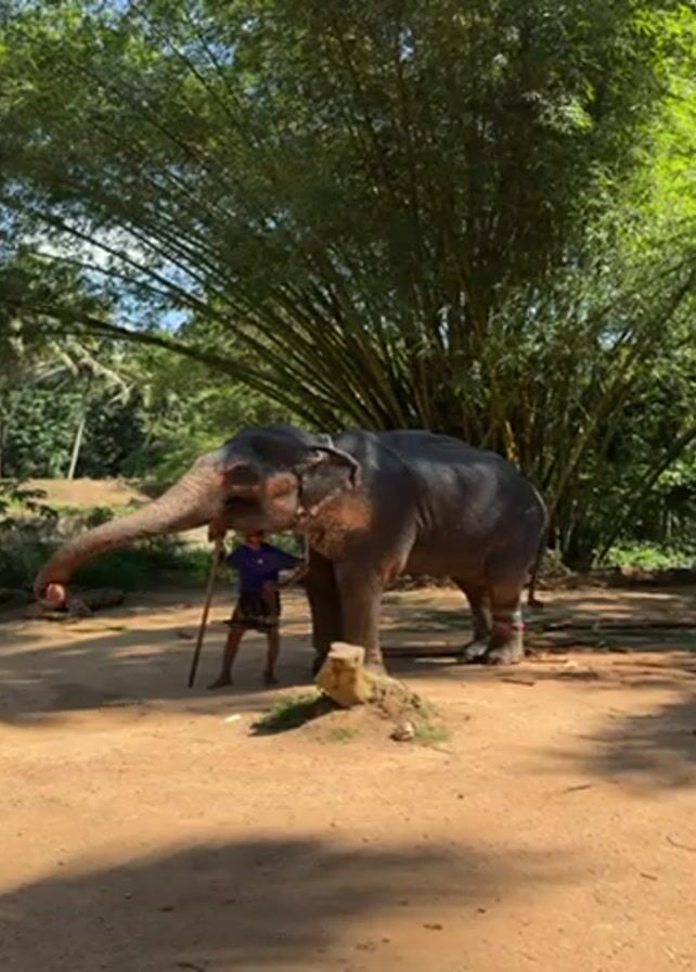 man and an elephant in a sunny, outdoor setting. The man, wearing a purple shirt and shorts, stands next to the large elephant. He is holding a long, thin stick, potentially for guidance or training. The elephant is facing left, and its trunk is curled downwards. They are positioned on a dirt ground area, with tall bamboo and other trees filling the background. The lighting is bright, highlighting the elephant's grey skin.
