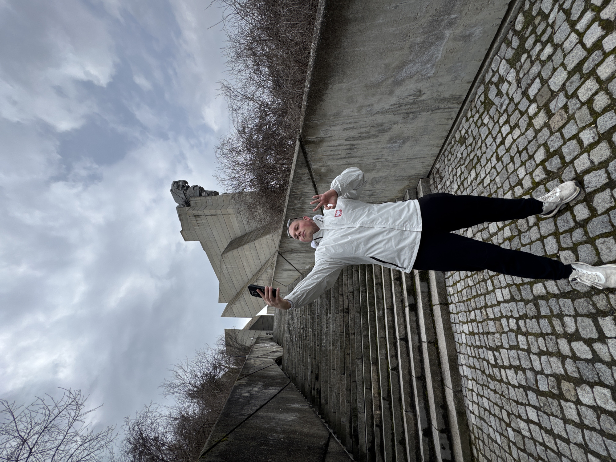 A male subject stands on a grey cobblestone path at the base of a monumental concrete staircase, facing towards the camera while holding a black smartphone in his raised right hand, apparently taking a selfie. He wears a white long-sleeved jacket with a red and white emblem on the left chest, black trousers, and white athletic shoes. His left hand forms an "OK" gesture. White sunglasses are perched on his head. The scene is located at the Monument to 1300 Years of Bulgaria in Shumen, Bulgaria. Behind the subject, a wide, multi-tiered concrete staircase ascends, flanked by imposing concrete walls. Further up and to the right, a section of the brutalist monument is visible, including angular concrete forms and a stylized sculptural element depicting a human head. Bare trees and dry shrubs line the slopes surrounding the concrete structures, indicating a cold season. The sky is overcast with a blanket of grey clouds.