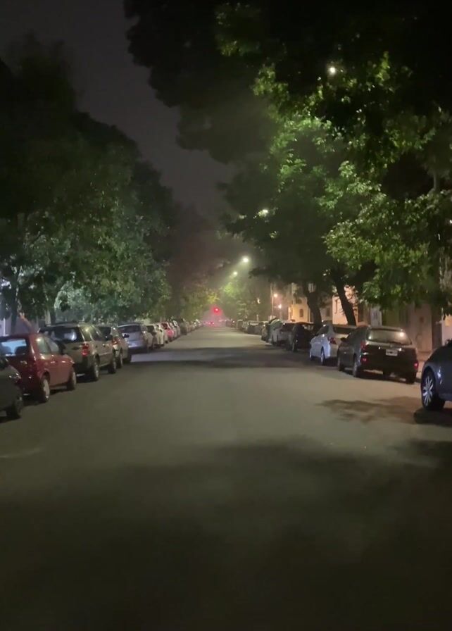 straight, quiet street at night. The street is lined with parked cars on both sides and tall, leafy trees that overhang the road. Streetlights illuminate the scene, casting a glow on the pavement and creating a slightly misty atmosphere. The sky is dark and overcast. The focus is on the center of the road, leading the eye to the distant end of the street.