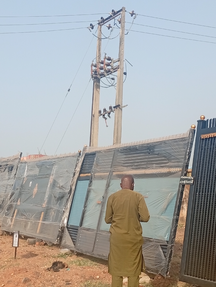 An outdoor scene in Adankolo, Nigeria, displays commercial goods and utility infrastructure under a clear, light blue sky. A male individual, viewed from the back, stands centrally on dry, reddish-brown earth. He is dressed in an olive-green tunic and matching trousers. Directly behind him and extending to the left and right is a staggered row of new, dark-colored metal gates or fence panels. Several of these panels feature integrated glass or reflective inserts and are wrapped in clear plastic sheeting. Visible on the plastic of one gate are partial alphanumeric details: "PMAWMY678" and "07038036012." An unwrapped, ornate gate with a gold-colored finial is partially visible on the far right. In the upper background, two concrete utility poles rise vertically, supporting an array of electrical components, including transformers, insulators, and multiple power lines. A small, white rectangular sign on a thin pole is embedded in the ground in the lower-left foreground.
