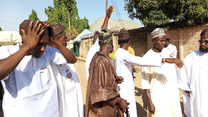 The image displays an outdoor scene in Afaka, Nigeria, populated by approximately seven adult males. The setting is a bright, clear day, with sunlight illuminating the subjects and environment. The ground surface consists of unpaved dirt. Individuals are dressed in traditional West African attire. In the immediate foreground on the left, a man in a white textured short-sleeved tunic and a brown cap is seen adjusting his cap with both hands, looking downwards. A pair of glasses is clipped into his shirt pocket. Behind him, another man in a white garment is partially visible, also wearing glasses. In the mid-ground, a man viewed from behind wears a long, brown patterned agbada or kaftan and a patterned cap; his right arm is raised, possibly gesturing or holding an object. To his right, another man in a white kaftan and patterned cap is facing left, extending his right arm forward, seemingly engaging with someone or pointing. He has a bracelet on his left wrist. On the far right, a man with a dark beard and sunglasses, wearing a white kaftan and a patterned cap, is partially visible. The background features single-story structures, some with bare walls and others with blue corrugated metal roofs, indicating residential or local buildings. Dense green foliage from trees is visible, along with a utility pole positioned centrally in the background. The overall scene suggests a group gathering or conversation on a street or open area.