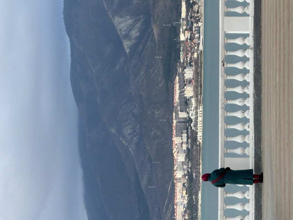 An individual stands on a tiled promenade in Gelendzhik, Russia, observed from behind