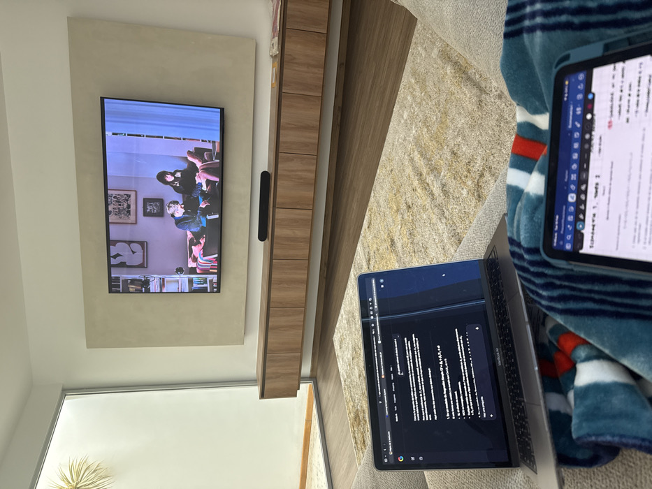 A television shows a program with four individuals. Next to the TV is a long wood panel cabinet. Foregrounded are a laptop and tablet on a blanket. The laptop screen displays text, while the tablet showcases a document with writing. Natural light floods the room from a large window, illuminating a plant in the corner. The flooring appears to be a neutral colored carpet.