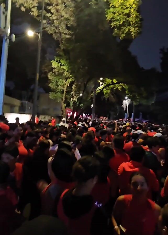 large crowd of people at night. The people are mostly wearing red shirts, suggesting a group activity or event. Streetlights and other artificial lighting illuminate the scene, and trees line the streets. There are several white tents in the background. People are standing and walking, and the camera moves through the crowd, providing a dynamic view. It appears to be an organized gathering.