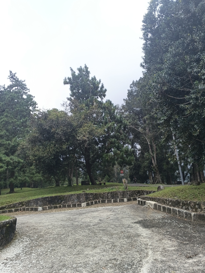 A concrete pathway leads through a park-like setting. The pathway is bordered by low stone walls. Beyond the walls is a grassy area with various trees, including evergreens. Further back, a road with a sign and a person can be seen. The sky is overcast.