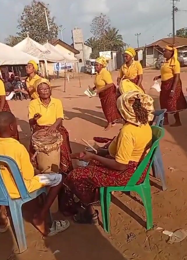 A daytime video shows a group of African women outdoors, performing. They wear matching yellow shirts and dark print skirts, with yellow headwraps. Some women are seated in plastic chairs, others are standing or walking around. One woman is playing a drum, and several others are dancing, using white fabric squares as props. A young boy, also wearing a yellow shirt, sits on a blue chair in the foreground. In the background, there are several white tents and a bus parked by a white building with a tower. The ground is covered in dirt and scattered leaves.
