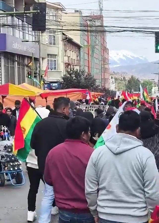 crowd of people marching down a city street. Most people are carrying flags, many of which appear to be Bolivian flags. There are buildings on either side of the street and tents or stalls set up. In the distance, snow-capped mountains can be seen. The traffic light is green. The camera follows the crowd from behind.