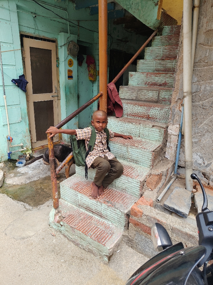 A young male child, estimated to be between 5-8 years old, is seated barefoot on the second step of an outdoor concrete staircase in Pedda Kammavaripalli, India