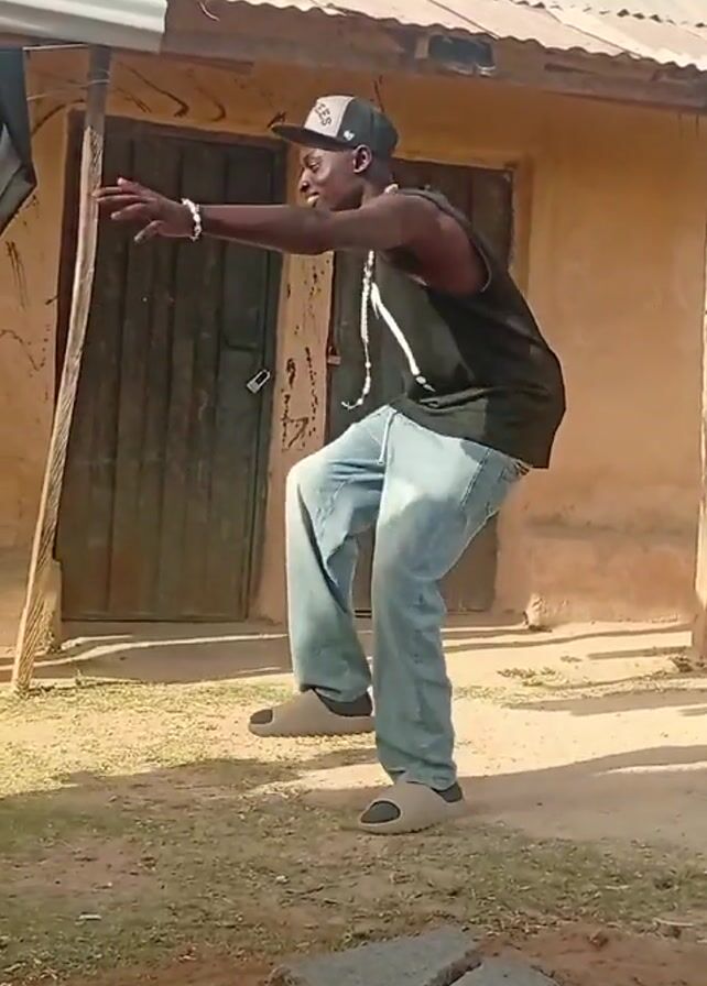 A man dances in front of a single story building with a corrugated metal roof