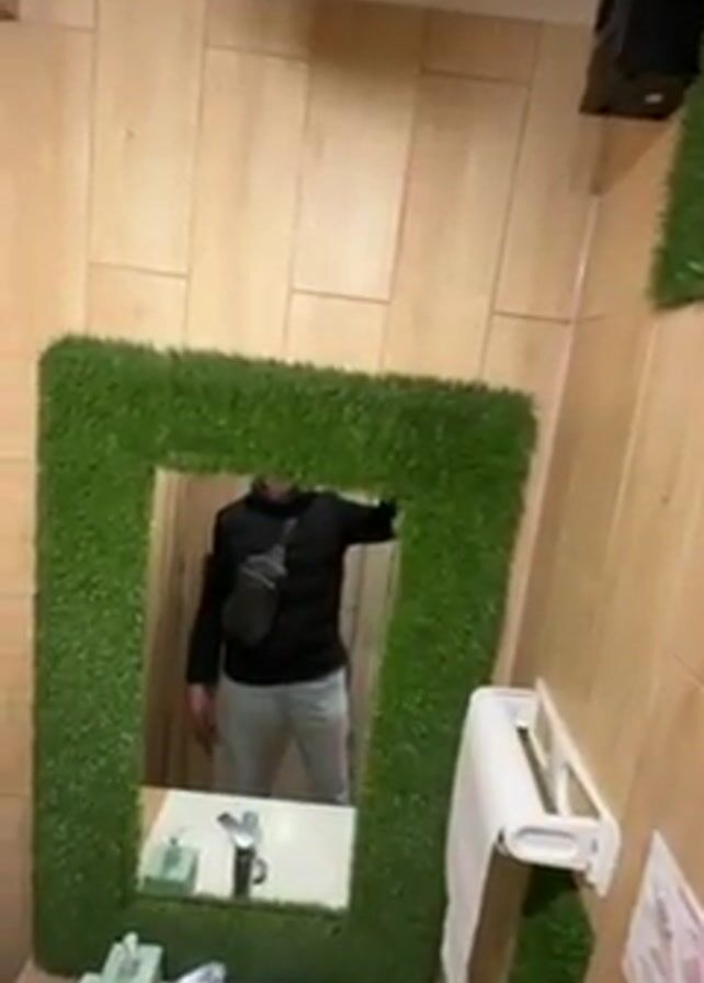 bathroom interior. The walls are paneled with light wood-grain. A mirror framed with artificial turf hangs above a white sink. A man takes a selfie in the mirror, wearing a black puffer jacket, gray pants, and a small black shoulder bag. He is centered in the mirror's reflection, holding his phone up to take the picture. To the right of the mirror, a matching strip of artificial turf runs down the wall. A toilet paper dispenser and a graphic, possibly a foot diagram, are visible on the wall as well. A black speaker is mounted in the upper right corner. The lighting in the room is bright. Music plays in the background.