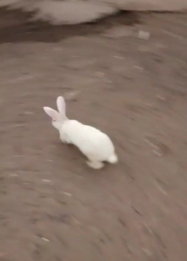 A video shot outdoors shows a white rabbit running on a dirt surface