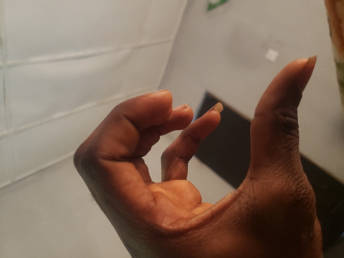 A close-up shows a dark-skinned hand gesturing towards the viewer. The thumb is extended upward, while the index and middle fingers are curved inward, creating a pinching motion. The nails are long and slightly unkempt. The hand is positioned against a background that includes white tiled walls and a dark rectangular object, possibly a piece of furniture. The lighting highlights the texture and wrinkles of the skin.