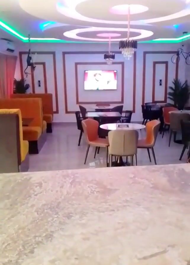 interior of a restaurant. The restaurant has booths with orange seating, round tables with various chairs around them, and white walls with framed panels. A television is mounted on the wall in the center of the room. The ceiling has decorative lighting with concentric circles and colored LED strips. There are plants in the corners of the room and a decorative bicycle on the wall. The video is shot from behind a counter or bar, showing the restaurant's seating area. No people are visible in the video.