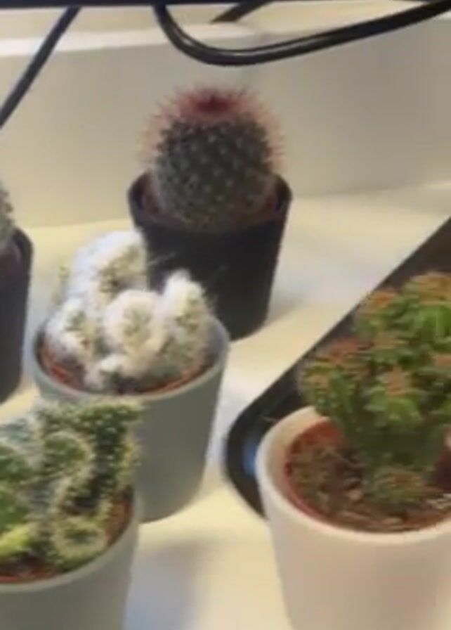 collection of small potted cacti and succulents arranged on a white shelf or surface, likely part of a desk or similar furniture