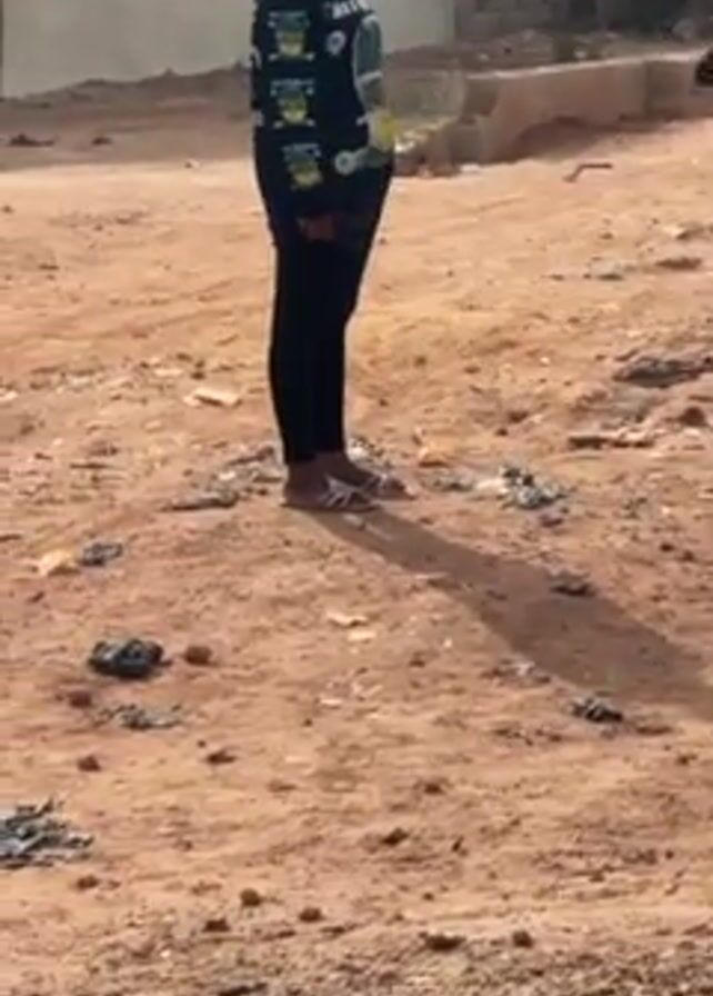 A woman in a black shirt and pants stands on a dirt road. A second woman in a red shirt and blue jeans walks up to her and the two stand together. Both women are carrying bags. The area is littered with trash and debris. There is a stack of cinder blocks nearby and several buildings in the background. The video is somewhat shaky.