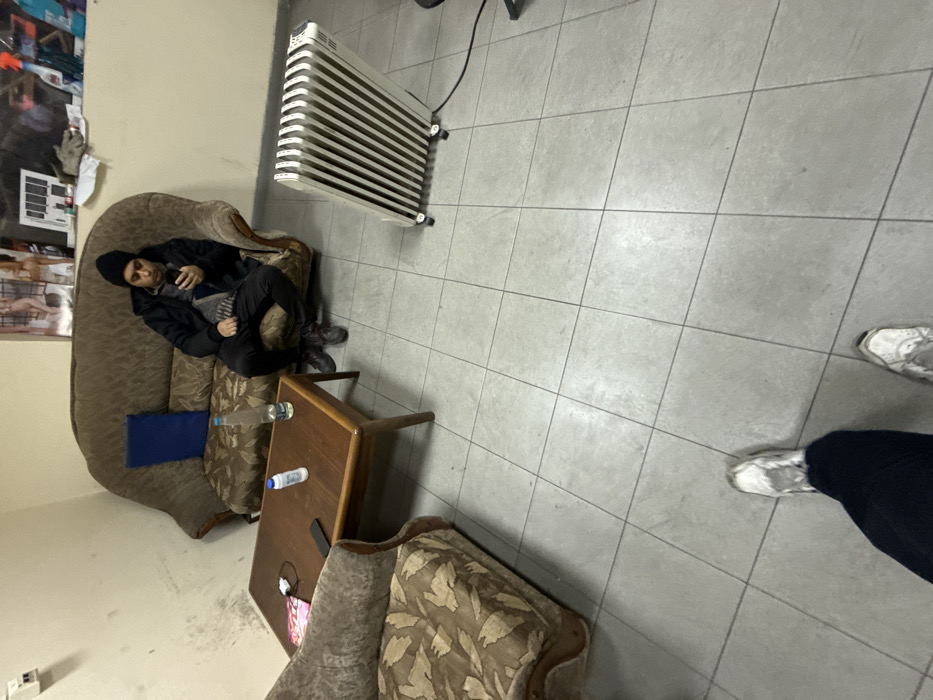 The scene depicts an interior room, specified as located in Stara Zagora, Bulgaria. The flooring consists of light gray square tiles, and the walls are a light beige, exhibiting some visible scuffing and discoloration, particularly on the lower left side. Artificial lighting illuminates the room. In the background, a single male subject is seated on a two-seater sofa upholstered in brown, patterned fabric with visible wooden armrests and detailing. He is wearing a black beanie, a black jacket over a striped top, and dark trousers, with dark footwear visible. He holds a black smartphone in both hands, directing his gaze downward at the screen. A blue rectangular cushion is propped on the left side of the sofa. In the midground, a rectangular wooden coffee table with tapered legs is positioned centrally. On its surface are a clear plastic water bottle (approximately half-full), a white plastic bottle with a blue cap, a black smartphone or similar device, and a colorful item resembling a magazine or document. To the left foreground, a single armchair, matching the style and upholstery of the sofa, is partially visible. To the right of the seated individual, a white, finned oil-filled electric heater on wheels is positioned on the floor, connected by a black power cable leading off-frame to the right. The wall behind the sofa displays various items, including a large poster or image, a smaller framed item, and miscellaneous objects such as cleaning supply bottles on a ledge to the far right. In the immediate foreground, the lower legs and feet of a second individual (the photographer) are visible, wearing dark trousers and white and gray athletic shoes, indicating a standing posture. No direct interaction between the two individuals is observed.