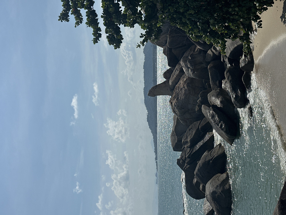 The image depicts a scenic coastal view, rotated for an unusual perspective. Jagged, dark-colored rocks dominate the right side, meeting a sandy beach. The ocean, shimmering with light, stretches towards a distant landmass under a sky filled with scattered clouds. The left side reveals more of the sky, while the upper portion is partially obscured by leafy tree branches. The overall scene suggests a natural, somewhat secluded beach location.