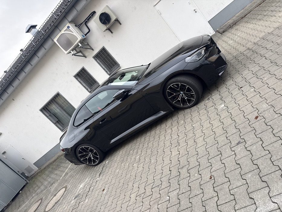 A black BMW 2 Series (G42) coupe is parked on a grey interlocking paver driveway, adjacent to a white building under an overcast sky