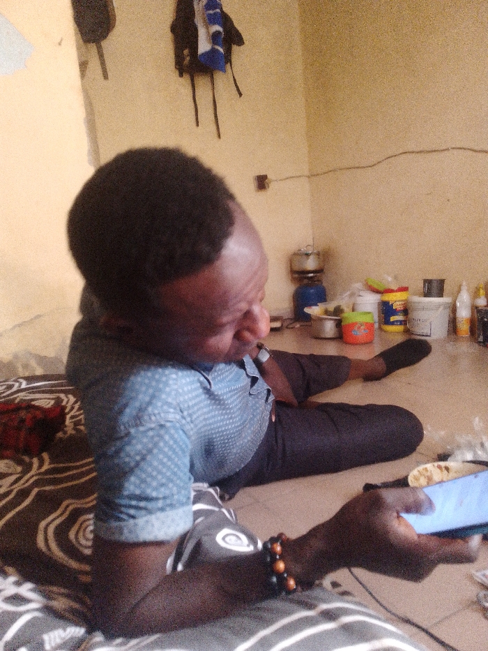 A man is seated on a patterned cushion, holding a mobile phone in his right hand. He is wearing a blue patterned shirt and dark pants. The man has a wooden bead bracelet on his wrist. Behind him, on the floor, are containers, a cooking pot on a gas stove, and what seems to be a dish. The walls are painted beige, and a backpack is hanging on the wall.