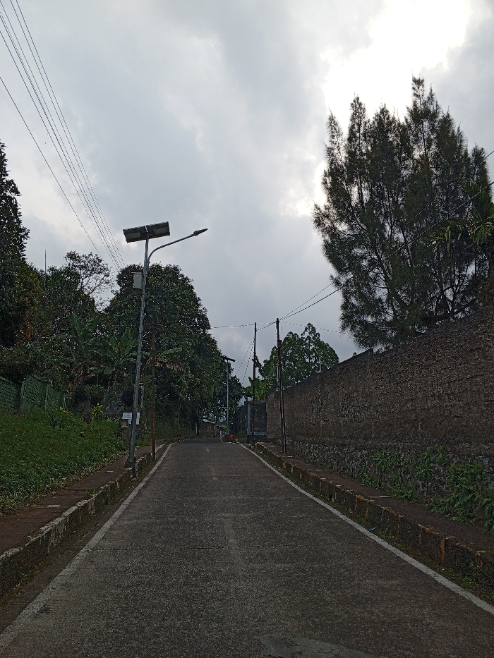 This image displays an ascending, paved road situated in Chennai, India, under an overcast sky. The road, appearing to be concrete or asphalt, features faded white lines marking its edges and curves gently to the left as it recedes into the distance. On the left side, a steep, green embankment covered in dense vegetation, including various trees and bushes, rises alongside the road. A green mesh fence runs along the upper portion of this embankment. A tall, gray metal utility pole stands prominently on the left, supporting a rectangular solar panel and a single street lamp fixture. Multiple black utility wires are strung overhead, running parallel to the road. Further down the road on the left, more dense foliage partially obscures what appear to be distant structures. The right side of the road is bordered by a tall, rough-textured stone or concrete wall, showing signs of weathering with some small plants growing at its base. Behind this wall, the dense canopy of trees is visible, with a tall, slender conifer-like tree prominent on the upper right, partially silhouetted against a brighter patch of sky. Several dark utility poles with overhead wires are also present along the right side. The sky is largely covered by gray clouds, providing diffused lighting to the scene. No individuals, vehicles, or observable activities are present.