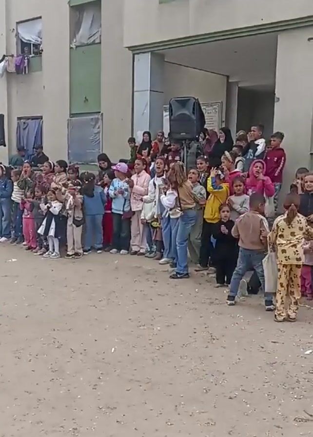 A group of children and a few adults are standing and cheering in front of a multi-story building. The building is painted in neutral tones with green accents and has visible damage with what appear to be bullet holes on its facade. Several windows are either covered or broken. The crowd is loosely organized in a line, facing an unseen subject. The adults stand mostly at the back. Two large speakers are positioned near the entrance of the building, and music is audible. The ground is a dusty, sandy color. The overall environment suggests an area of conflict or past conflict due to the visible damage to the building.