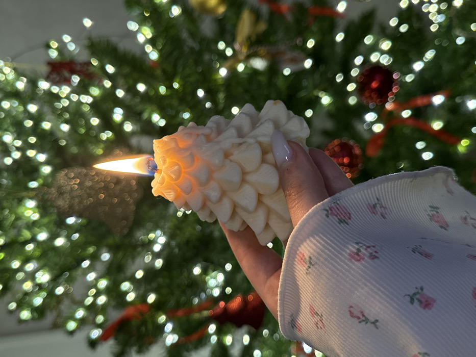 A lit, cone-shaped candle with a flickering flame is held in a hand with light nail polish. The background features a blurred Christmas tree decorated with lights and red ornaments. The person is wearing a white, floral-patterned sleeve. The overall tone is warm and festive, suggestive of a holiday celebration.