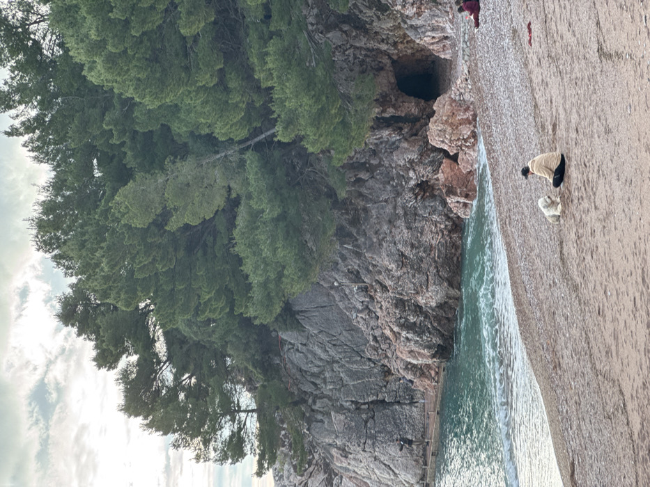A beach scene features a steep, rocky cliff face covered in lush green trees on the left. The cliff descends into the sea, with small waves gently lapping the shore. On the sandy beach to the right, a person in a light-colored jacket stands next to a small, white dog. Further up the beach, another individual is visible. A dark cave is nestled within the cliff face, adding depth to the scene. The sky above is slightly cloudy.