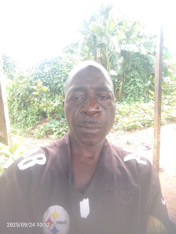 This image depicts an adult male in an outdoor environment in Tuaniako, Nigeria, amidst dense tropical vegetation