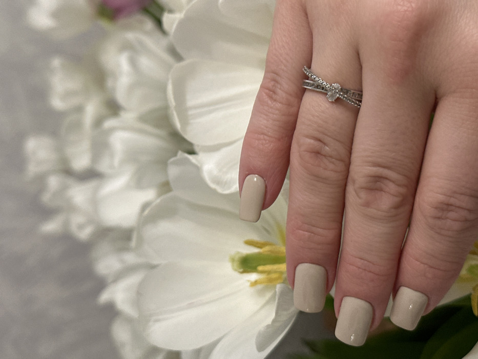 A close-up photograph taken in Nekrasovskiy, Russia, displays the dorsal aspect of a human left hand. The hand features light-toned skin, and all visible fingernails are manicured with a glossy, opaque beige nail polish. A silver-toned ring, characterized by a crossover or multi-band design embellished with small clear stones and a central bow-shaped element, is worn on the ring finger. The background is softly blurred, predominantly featuring a dense cluster of white flowers, consistent with tulips, one of which shows a green pistil and yellow stamens.