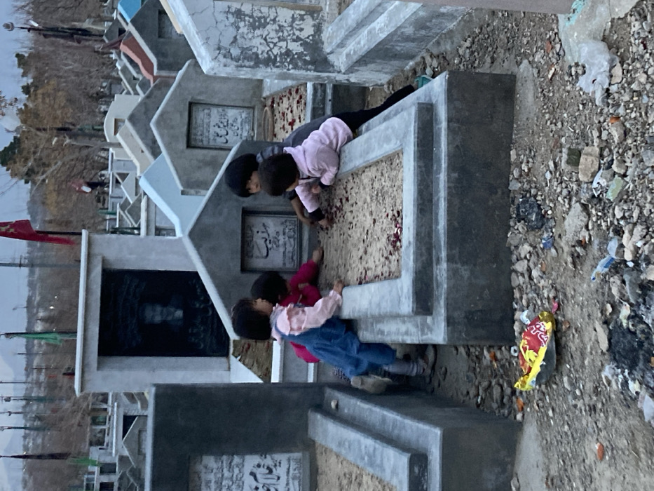 This image depicts a cemetery located in Quetta City Tehsil, Pakistan. Four young children are observed interacting within the graveyard environment. In the mid-ground, four children, appearing to be between approximately 2 and 6 years old, are gathered around two adjacent concrete-lined graves. The grave in the immediate center is a rectangular concrete structure filled with light-colored sand and scattered red flower petals. A child in a light pink hoodie and dark pants kneels on the right side of this grave, leaning over its edge with hands engaged with the sandy surface. To their left, another child in a dark grey top sits or crouches on the edge of the same grave, observing. A third child in a red/pink long-sleeved garment is positioned on the adjacent grave to the left, facing away from the camera, also interacting with the sandy surface. A fourth child, wearing blue denim overalls and a light pink long-sleeved shirt, stands to the far left, leaning over the edge of this second grave. The ground between the graves is unpaved, consisting of loose soil, small rocks, and scattered debris including plastic fragments and a deflated yellow and red foil balloon. Behind the children, numerous other gravestones of various designs are visible. A prominent headstone, directly behind the children, is a light-colored concrete structure with a framed dark portrait of a man featuring a mustache. Adjacent gravestones include one with legible Arabic script inscribed on its face and others with simple concrete forms, some capped with light blue paint. In the background, the cemetery extends into the distance with a high density of similar grave structures. A red flag with a yellow emblem is visible atop a pole to the right, and several green flags are also discernible further in the distance. Sparse, deciduous trees are scattered throughout the landscape. Distant mountains rise under an overcast or hazy sky.