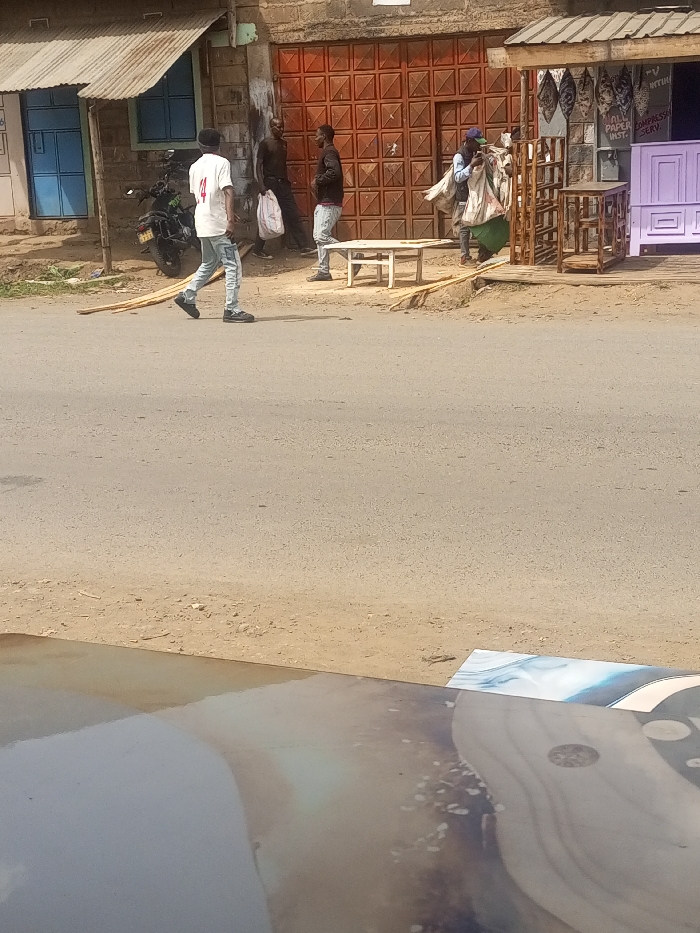 The image depicts an outdoor street scene within Kiamaina ward, Kenya, under bright daylight conditions. In the foreground, a paved asphalt road extends across the frame, with a dirt shoulder on both sides. The bottom portion of the image shows a blurred, reflective surface, likely a tabletop or dashboard from which the photograph was captured. In the midground, several individuals and structures are visible along the dirt shoulder. From left to right: * A male subject, wearing a white t-shirt with a number "4" on the back, light blue ripped jeans, and dark shoes, walks from right to left across the paved road. * Behind him, parked on the dirt shoulder in front of a building with a corrugated metal roof and blue window/door, is a black motorcycle. * Adjacent to the motorcycle, in front of a building with a large, reddish-brown patterned metal gate, two male subjects are standing. One, wearing a dark t-shirt and trousers, holds a white bag in his left hand. The other, wearing a dark long-sleeved shirt and light blue jeans, faces him. * To their right, on the dirt shoulder, a small white wooden table with simple legs is present. * Further right, a male subject wearing a blue cap, light-colored long-sleeved shirt, and a green garment (possibly a skirt or kikoi) is carrying multiple large, light-colored sacks over his shoulder, moving towards the right side of the frame. * He is passing in front of a shop with a corrugated metal overhang. The shop displays various items including wooden shelving units, a purple headboard or bed frame, and printed papers/posters on the wall, some advertising "PAPER COMPRESS SERV" and "TV". Decorative shields are mounted above the shop's display area. * Several long, thin wooden poles or beams lie horizontally on the dirt shoulder in front of the white table.