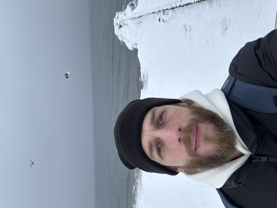 A medium shot captures an adult male in Zelenogradsk, Russia, standing on a snow-covered shoreline beside the Baltic Sea under an overcast sky. The man, with light skin, blue eyes, and a light brown beard, faces the camera with a neutral expression. He wears a black beanie, a white hooded sweatshirt, and a black puffer jacket, with a dark blue backpack strap visible on his right shoulder. The foreground and midground feature a thick layer of snow covering the ground, extending to a snow and ice-encrusted wooden pier or breakwater visible on the right. The choppy grey waters of the sea occupy the midground, with small white birds visible on its surface in the distance. The sky is a uniform grey, blending with the sea horizon. Two birds, likely gulls, are in flight in the upper left and upper right portions of the frame. The scene indicates a cold, winter coastal environment.