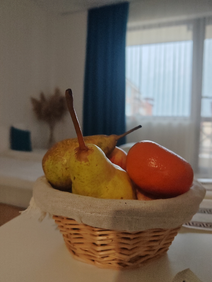 The image displays an indoor scene located in Sveti Vlas, Bulgaria. In the foreground, a light-brown woven wicker basket, lined with a light-colored fabric, is positioned on a flat, light-toned surface, likely a table. The basket contains several fruits: prominently visible are at least three yellow-green pears with brown stems, and one oval-shaped orange fruit. A patterned textile, possibly a placemat, is partially visible on the table surface to the right. The background is out of focus. To the left, blurred elements of the room include a light-colored wall, a piece of furniture (possibly a bed or sofa) with a dark blue cushion, and a vase containing dried botanical arrangements. To the right, a large window or glass door with light-colored vertical blinds is partially obscured by a dark blue curtain on its left side. Through the window, a blurred exterior view shows architectural details of an adjacent building, including a reddish structure. No individuals or active interactions are depicted.
