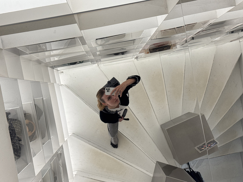 A single individual is depicted taking a selfie within a highly reflective, geometrically complex interior space
