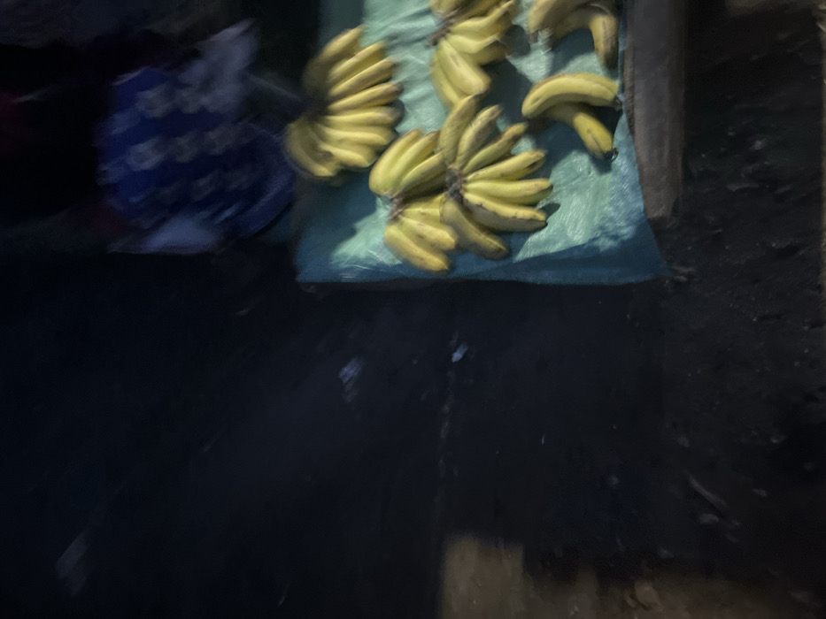 The image depicts a nighttime or low-light scene in Gitothua ward, Kenya. On the right side, multiple bunches of ripe yellow bananas are displayed on a light green or teal fabric-covered surface, likely a market stall. A person, largely out of focus, is partially visible behind the bananas, identifiable by dark clothing and a blue patterned garment. The left side of the frame shows a dark, indistinct ground surface. No specific actions or interactions are clearly discernible beyond the arrangement of goods for sale.