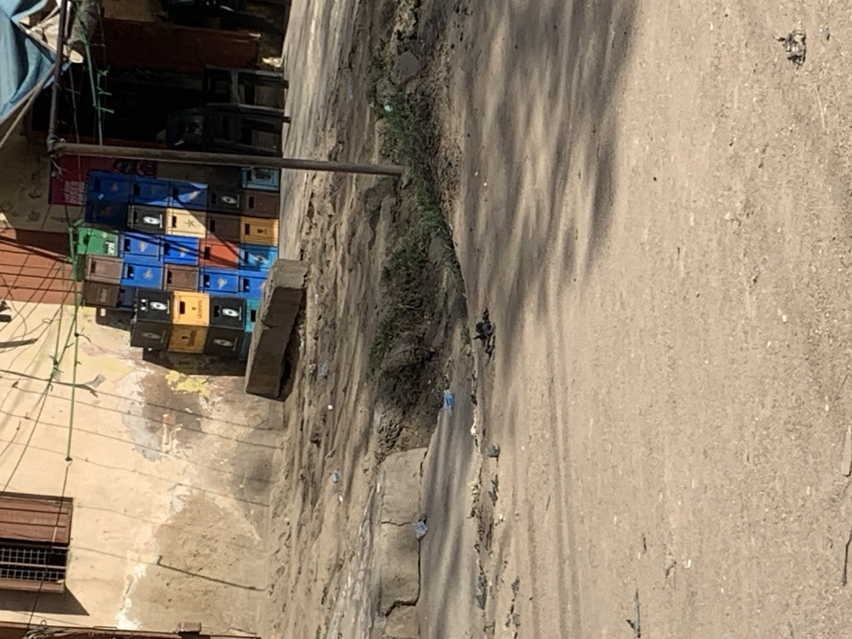 The image depicts an unpaved, dusty street scene in Sabon Gari East, Nigeria, under daylight conditions, indicated by distinct shadows. In the foreground, the ground is a light brown dirt surface, showing minor undulations and scattered dark debris, including pieces of plastic and other refuse. A fractured concrete curb or low wall runs across the mid-left, beyond which lies a shallow, narrow depression containing sparse green vegetation and more litter. To the right of this depression, a large, dark gray rectangular concrete block rests horizontally on the ground. A slender, dark vertical metal pole stands further right, supporting a dark blue or green fabric awning that extends over a structure to the right. In the background, on the left, is a building wall with faded, peeling light-colored paint, exhibiting patches of darker staining and exposed underlayers. An upper-story window with closed brown slatted shutters is visible. Several wires, some with green plastic ties, are strung across the wall and overhead. To the right, against another building or stall, a large stack of multi-colored plastic beverage crates forms a stepped arrangement. Visible crate colors include blue, yellow, green, and brown, with some bearing logos such as "STAR" and "GUINNESS." Adjacent to the stacked crates, beneath the fabric awning, several dark chairs are discernible, suggesting an open-air commercial establishment. No individuals are present in the frame.