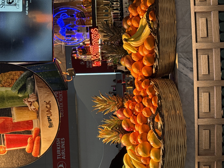 The scene depicts a commercial indoor environment, identified as likely Istanbul Airport in Arnavutköy, Turkey, given the visible "Turkish Airlines" branding. In the foreground, two large, round wicker baskets are filled with a vibrant display of fresh produce. The baskets contain numerous oranges, mandarins, and grapefruits, interspersed with several whole pineapples featuring their spiky crowns, and at least one red pomegranate. A bunch of yellow bananas rests on the fruit in the right basket. These baskets sit on a light-colored, possibly marble, countertop, which is supported by a wooden base with a rectangular panel design. Above and behind the fruit display, a bar area is visible. A red neon sign spells "Wiings." Behind this sign, various bottles of alcoholic spirits, including vodka and Johnnie Walker whiskey, are arranged on shelves. To the right of the "Wiings" sign, a blue neon sign depicts a stylized beer glass. Further back, another "Turkish Airlines" logo is visible on a red panel. Hanging centrally in the upper part of the image is a large, circular promotional disc for "Burger JACK." This advertisement displays glasses of red, yellow, and green juices or smoothies, accompanied by fresh ingredients such as carrots, ginger, cucumbers, and pineapple. To the right of this disc, a large flat-screen television is mounted, displaying text that includes "Call My Name" and "SHOW." In the distant background, several indistinct human figures are partially visible in a brightly lit area, suggesting other patrons or staff within the facility. The overall lighting is artificial and bright, highlighting the commercial nature of the setting.