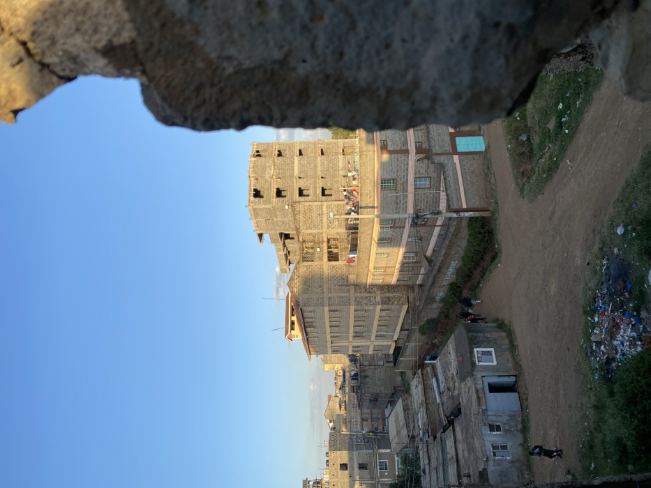 A view from above shows a developing urban area. In the distance, tall buildings under construction rise into a clear blue sky. Closer, densely packed residences line a dirt path. Lush green foliage gives way to piles of trash alongside the path. A foreground rock wall frames the scene, creating a sense of peering into this area. The image captures a mix of development, poverty, and the natural environment.