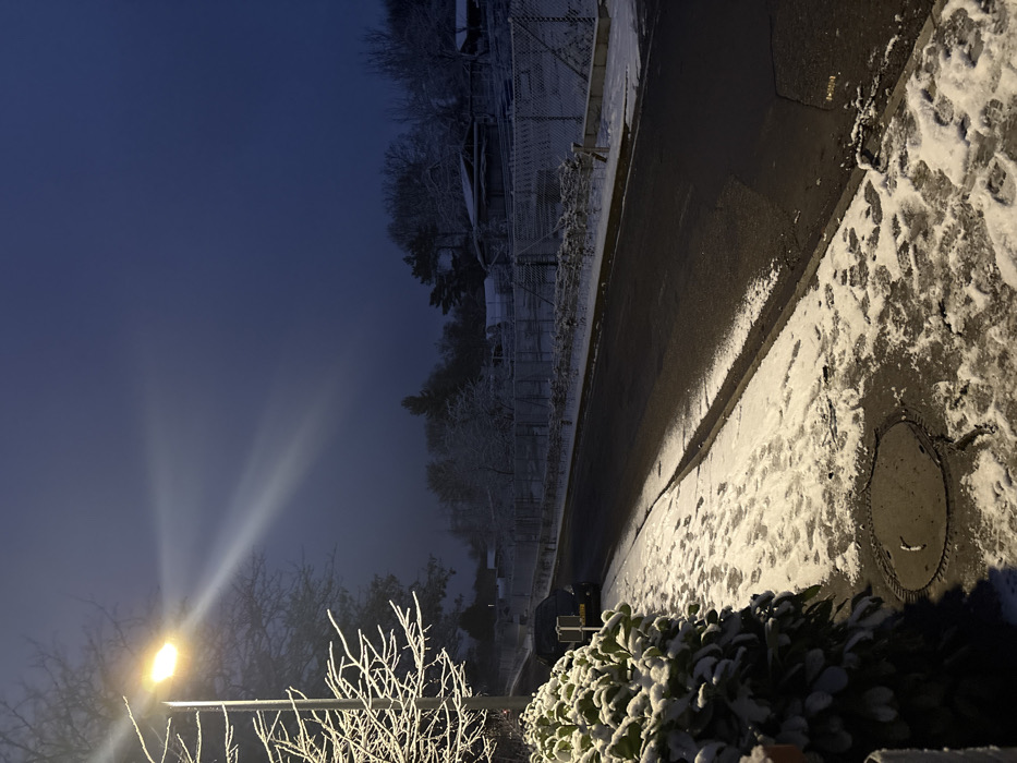 An upward-angled street scene at night. A lit streetlamp casts light on frosted bushes and icy branches. The road is clear, but snow covers the sidewalks and a nearby manhole. Fences and trees coated in snow line the street, leading to houses in the distance. The dark blue sky above creates a stark contrast to the light cast by the streetlamp, with streaks indicating its brightness.