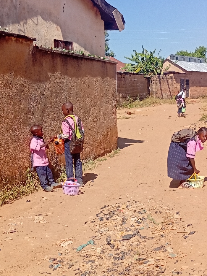 The image depicts an unpaved street scene in Zawan, Nigeria, under clear daylight conditions. The ground consists of reddish-brown dirt, heavily strewn with dark litter and debris in the foreground and mid-ground. On the left, a textured light-brown wall with a darker coping runs horizontally, partially obscuring a cream-colored building with a distinctive, possibly thatched or poorly maintained, roofline. A small barred window is visible on this upper building. Sparse green vegetation grows at the base of the wall. Four individuals, appearing to be school-aged children, are present: 1. **Subject 1 (Left foreground):** A young male child, dark-skinned, with short hair, wears a pink short-sleeved shirt, dark blue plaid trousers, and dark shoes. He leans against the wall, holding a small orange woven basket in his left hand, and extends his right hand forward, appearing to interact with Subject 2. 2. **Subject 2 (Center-left):** A male child, dark-skinned, with short hair, wears a pink short-sleeved shirt, dark blue plaid trousers, and a brown backpack. A light green or yellow fabric is draped around his neck/shoulder. He stands facing Subject 1, holding an orange woven basket in his right hand. A purple plastic basket containing items rests on the ground near his feet. 3. **Subject 3 (Right mid-ground):** A female child, dark-skinned, with a dark backpack, wears a pink shirt, a dark blue and white striped skirt, and light-soled shoes. She is depicted bending forward, reaching towards a light green woven basket positioned on the ground. 4. **Subject 4 (Far background, right):** A child or young person, partially obscured, wears a white shirt and dark trousers/skirt, carrying a small green container or bag. This individual walks away from the camera, further down the dirt road. In the background, beyond a low wall, several single-story structures with corrugated metal roofs and brick walls are visible. Green foliage, possibly banana trees, grows behind a wall in the mid-background. Faint electrical lines are discernible against the clear blue sky.