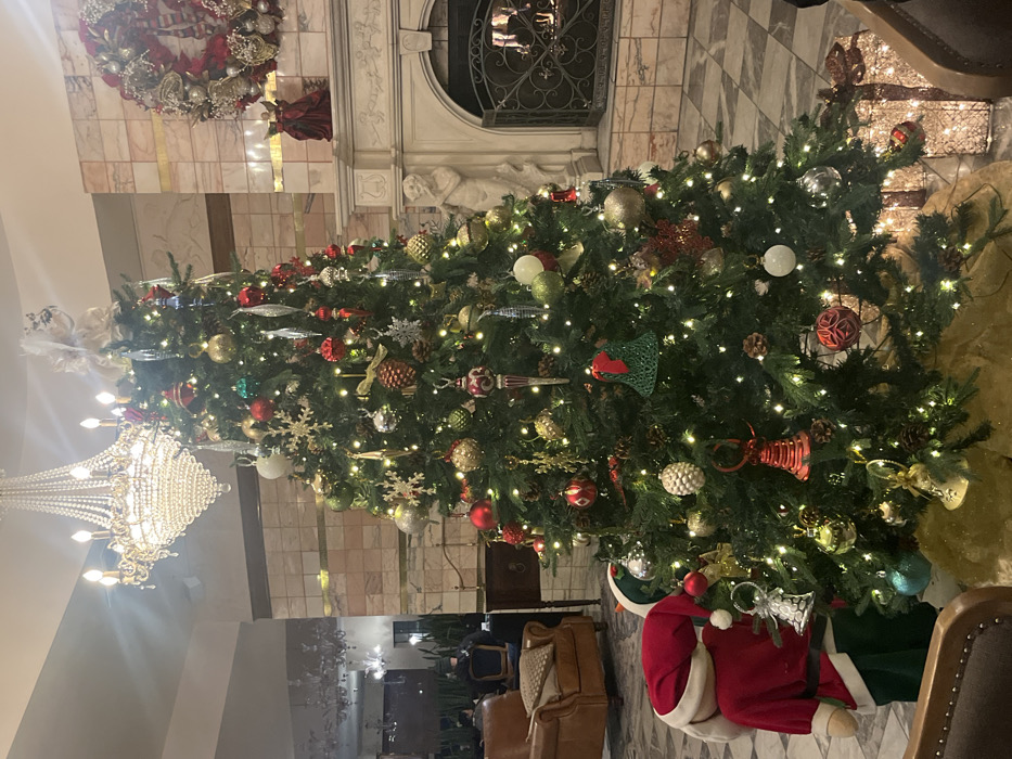 A tall, decorated Christmas tree dominates the room, illuminated by strings of lights. Ornaments of various sizes and colors adorn the branches. A large chandelier hangs nearby, adding to the festive ambiance. The tree stands in front of a stone wall, decorated with a wreath. A Santa figure with a bell rests near the base of the tree. Leather chairs are visible in the background.