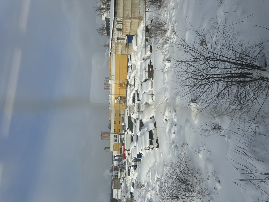 This image depicts a snowy, industrial-commercial landscape in Podolsk, Russia, specifically an area adjacent to Leningradskaya ulitsa, 7, looking northeast towards the "Мебельный Центр Формат" (Furniture Center Format). The foreground is dominated by a field covered in deep, undisturbed snow. Bare, dormant deciduous shrubs and small trees with exposed branches are scattered throughout, along with patches of dried stalks resembling cattails protruding from the snow in the lower left. A single, faint set of human or animal tracks is visible in the snow, extending from the lower left towards the midground. In the midground, a large open lot is filled with numerous vehicles, predominantly light trucks, vans, and possibly minivans. Most vehicles are heavily covered in deep snow, with some appearing partially obscured by tarpaulins beneath the snow. The vehicles are stationary, suggesting a storage or salvage yard. No individuals or active movements are observed. The background features several structures. The most prominent is a large, two-story commercial building with a bright yellow lower facade and a white upper section. Red lettering on the white section clearly reads "ТЦ МЕБЕЛЬ" (Furniture Shopping Center) and below it, "МЕБЕЛЬНЫЙ САЛОН" (Furniture Salon). To the right of this building, a plain, two-story, block-constructed building with a grey lower half and a lighter upper half is visible, featuring multiple windows and a blue door on the ground level. Further to the left, partially obscured by the yellow building, are smaller industrial or warehouse-style buildings with white roofs; one exhibits a plume of white smoke rising from a chimney. In the far background, several multi-story residential buildings are discernible, including a prominent reddish-brown high-rise and a lighter-colored, multi-story building. The sky is partially cloudy, displaying patches of bright blue and areas of light grey overcast conditions. A faint vertical streak and some horizontal lines, likely reflections, are present across the image, consistent with a photograph taken through a window. The overall scene is devoid of human activity, conveying a quiet, winter atmosphere.