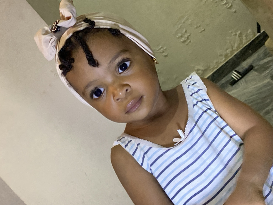 A young child, likely a toddler, is captured in a close-up shot. She wears a light-colored head wrap adorned with a bow on top and a striped blue and white tank top with a small ribbon detail. Her gaze is directed forward with dark, expressive eyes. One small gold earring is visible. The background is a plain, light-colored wall, with a blurry pair of sandals visible in the upper right corner. The overall lighting is soft, casting subtle shadows.