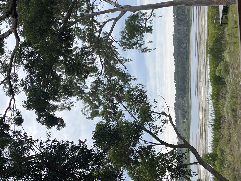 The image displays an outdoor landscape view, consistent with a location in La Barra, Uruguay, overlooking a substantial body of water, likely a lagoon or a wide river. The foreground is framed by dense, dark green tree foliage and branches from multiple trees, primarily on the upper and left sides. The lower foreground consists of a band of green marshland vegetation, including reeds and shrubs, extending to the water's edge. A wooden structure, resembling a partial deck or pier, with two small, metallic cylindrical objects (possibly stools or bollards), is visible in the lower right corner, partially obscured by a tree trunk. A horizontal brown surface, likely a railing, runs across the bottom edge of the frame. The midground features a calm expanse of water, characterized by light-colored, irregular patches of what appears to be submerged or floating aquatic vegetation or sediment. The water surface reflects an overcast or partly cloudy sky. In the background, a dense, dark green treeline forms a continuous forest along the distant bank of the water. Above this treeline, a light blue sky with scattered white and grey clouds is visible. A faint, light-colored dirt path or track can be observed on the distant bank, winding slightly. No individuals, animals, or active events are present within the scene.